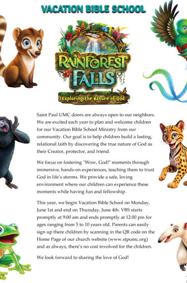 It’s time to begin planning our 2026 Vacation Bible School. Shortly, Charlie will set out the Volunteer’s Sign Up sheetsand we’ll have a link to register your children or grandkidsto enjoy the wonders of Rainforest Falls and explore thenature of God!VBS begins on Monday, June 1st and ends on Thursday, June 4th with a start time each day at 9:00 am and endingat 12:00 pm.We’ll keep you updated here and hope you’ll be able to helpwith VBS!